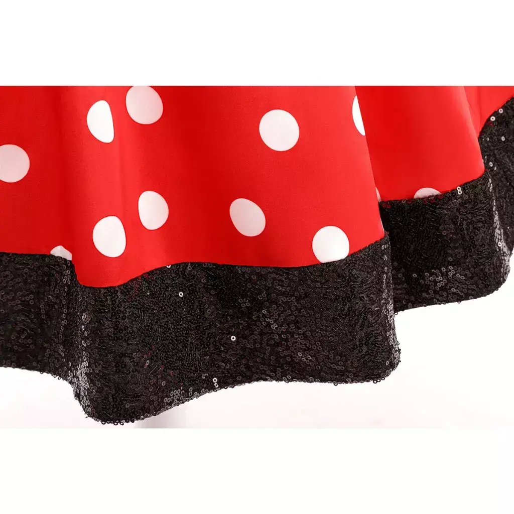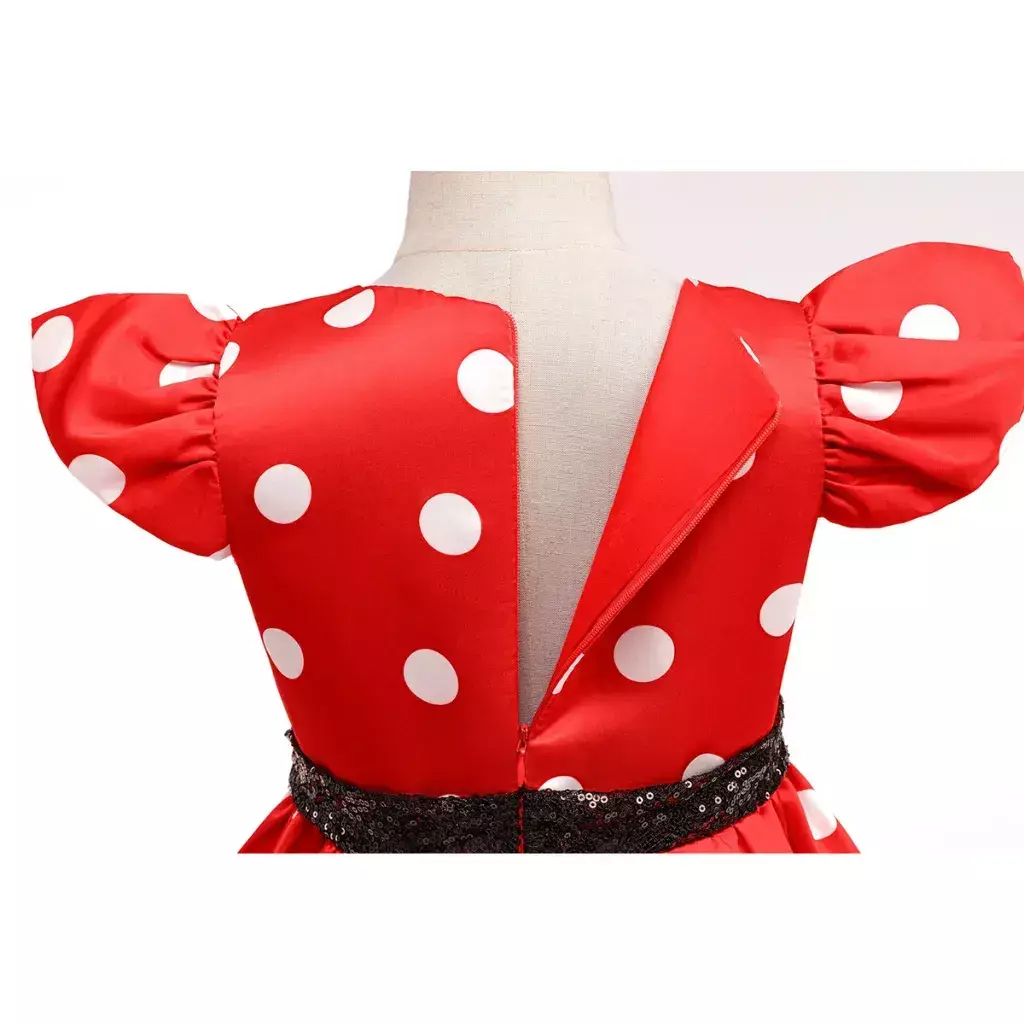 Com seu tom vermelho intenso, o vestido destaca-se, refletindo a personalidade alegre e divertida da Minnie Mouse. A cor chama atenção e é perfeita para as crianças que adoram se sentir especiais.